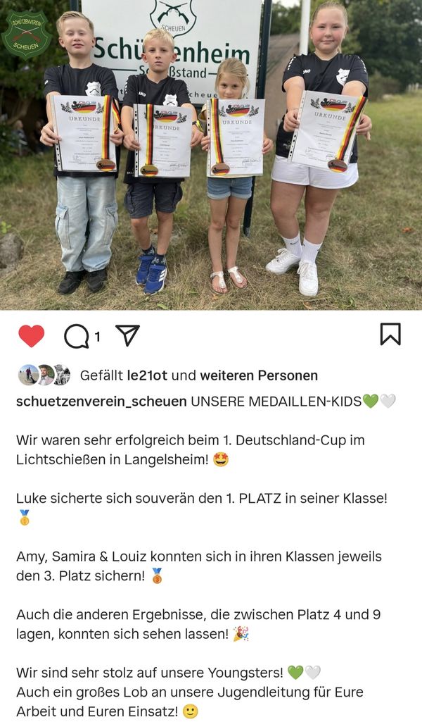 Heidenreich Vizekreismeister in der Klasser Schüler III und IV. Somit können wir erneut eine Kachel an unserer Wand im Schützenheim anbringen! Wir freuen uns über diese tollen Ergebnisse und gratulieren nochmals allen Teilnehmern zu den Auszeichnungen. Aber auch die anderen Teilnehmer aus Scheuen können auf ihre Ergebnisse mächtig stolz sein
